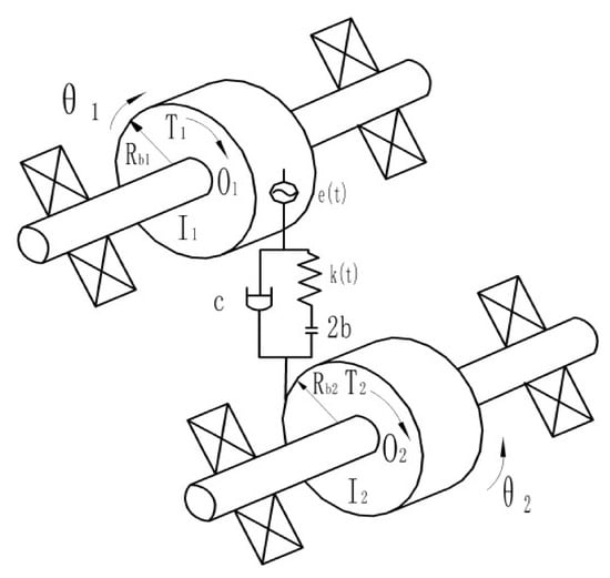 where and are the rotational angles of the driving gear and the driven gear, respectively. and are the rotational angles caused by input drive torque and output load torque, respectively. Similarly, T1D and T2D are the input drive torques of the driving gear and the driven gear, respectively. T1L and T2L are the output load torques of the driving gear and the driven gear, respectively. Rb1 and Rb2 are the base radii. e(t) is the geometric transmission error along with the meshing line. km is the meshing stiffness, and c is the damp.