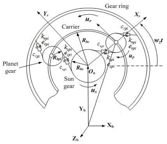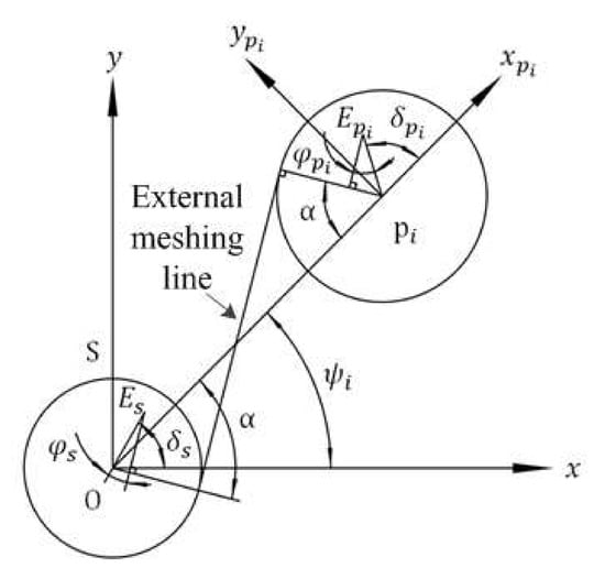 where , , and are the rotational speeds of the sun gear, planet gear, and gear ring. is the initial angle between the ith planet gear and the x axis. The projection of Es and Epi on the external meshing line can be expressed as
