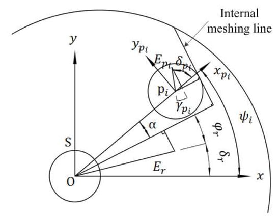 During the engagement process, the meshing force is determined by the relative displacement along with the meshing line and the meshing stiffness of each component. The relative displacement along with the meshing line is composed of the rotational displacement and the eccentric error of each gear. The eccentric errors which contain the manufacturing and vibration errors of the sun gear, planet gear, and gear ring are labeled Es, Epi, and Er. is the angle between Es and the external meshing line of the ith planet gear. is the angle between Es and the x axis. and are the angles between Epi and the internal and external meshing lines, respectively. is the angle between Epi and the xpi axis. is the angle between Er and the internal meshing line of the ith planet gear. is the angle between Er and the x axis. From Figure 7 and Figure 8, the following geometric relationship can be obtained: