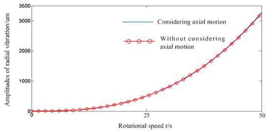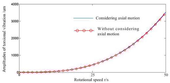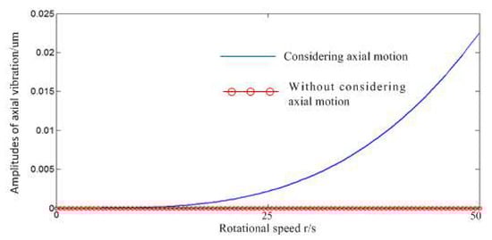where K is the stiffness coefficient, q0 is the initial distance of the contact surface, q is the actual motion displacement, and STEP is the step function. The simulated results are shown in Figure 9, Figure 10 and Figure 11. As the rotational speed increased from 1 to 50 r/s, the torsional, radial, and axial vibrations became more severe. The torsional and radial vibrations were almost the same when considering axial motion or not, which means that the axial motion made no difference to the dynamic characteristics. Moreover, Figure 11 shows that the difference of the axial vibration amplitudes in the z axis was several times lower than the torsional and radial vibrations. Each pair of meshing gears had a symmetrical structure, and the dynamic characteristics had periodic behavior. Figure 10 shows that the radial vibrations were very close in the x and y axes. Hence, the axial vibration of the gears could be neglected in the dynamic analysis of the DCDS, especially at low frequencies.