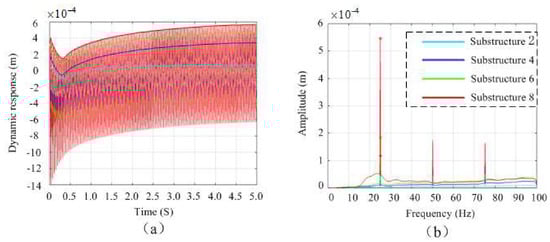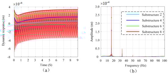 Then, the time–frequency domain dynamic characteristics of the different substructures in the transmission process were computed and analyzed by the dynamic model. Figure 12 shows the dynamic response of the DCDS with the driving of the single main motor 1 at the speed of 600 r/min. At this time, the rotational speeds of the gears related to the assistant motor 2 were 0, and the ring gear could be considered to be fixed. Figure 13 shows the dynamic response of the DCDS with the driving of the single assistant motor 2 at the same rotational speed. At this time, the rotational speeds of the sun gear and related gears were 0. From the time domain curve, the varying trend of each substructure driven by the main motor 1 and assistant motor 2 was consistent. For the asymmetrical transmission structure, the amplitude of the dynamic response driven by the main motor 1 was relatively larger than that driven by the assistant motor 2. As can be seen in the frequency domain curve, in the initial state, the dynamic response of each substructure mainly consisted of first, second, and third harmonic frequencies. The amplitude of each harmonic frequency increased with the increasing of the rotational speed, and the stabilizing time became longer as well.
