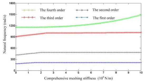 The natural characteristics are related to the meshing stiffness of the gear. The variation of the natural frequency along with the increase of the meshing stiffness is shown in Figure 14. The first and second vibration modes were barely affected by the increasing of the meshing stiffness; the first two vibration modes were mainly caused by the mass wheel at the end of the shaft. The variation trend of the third and fourth order vibrations indicates that improving meshing stiffness can increase the natural frequency. The third vibration mode increased as the meshing stiffness improved from 0 to 10 N/m; the third order vibration was mainly generated by the bevel gear set, and the amplitude was obviously affected by the meshing stiffness. Meanwhile, the fourth vibration mode increased from 1167.1 to 1574.5 rad/s. The fourth order vibration mode reached a stable value more slowly than the first three vibration modes. When the meshing stiffness was set to N/m, which is approximate to the actual value, the first four natural frequencies could be calculated as 219.604, 500.219, 1083.379, and 1389.928 rad/s, respectively.