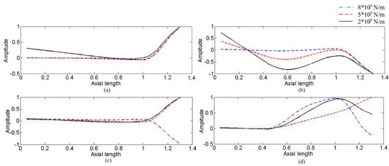 The normalized model of the first four vibration modes with different meshing stiffness: (a) The first mode shape varying from the axial length; (b) the second mode shape varying from the axial length; (c) the third mode shape varying from the axial length; (d) the fourth mode shape varying from the axial length.