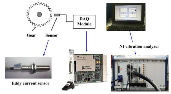 To verify the proposed comprehensive dynamic model of the DCDS, the natural frequency and dynamic response were tested by experiment. The experimental platform of the DCDS is shown in Figure 16. The variation of the acceleration vibration response of the DCDS was measured by an NI vibration analyzer. Triaxial acceleration sensors were selected to collect vibration signals, and the dynamic performance of the DCDS was tested by eddy current sensors and an NI vibration monitoring analyzer, as shown in Figure 17, so that the torsional and radial vibration of the gear set and power shaft could be measured.