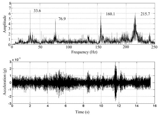 The rotational speed of the dual motors could be set from 500 to 3000 r/min. According to sampling theorem , the sampling frequency was 1000 Hz in order to ensure the reliability of the experimental data. The vibration voltage signal (k = 0, 1, 2, …, N, where N is the number of samples) collected by the acceleration sensor was converted into an acceleration signal with unit conversion; then, the time domain signal could be obtained. Figure 17 shows the filtered average curve after the separation of the trend term and the noise signal by an IIR digital filter. In order to obtain displacement signals, the acceleration signal needed to be integrated twice through the trapezoidal integral formula /2. Finally, the frequency characteristic curve could be obtained by DFT: . Figure 18 shows the original time domain characteristic curve and the first four natural frequencies by DFT of the DCDS.