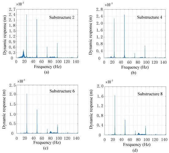 The experimental results of the dynamic response for the DCDS are shown in Figure 19. The variation trend of the experimental dynamic responses was consistent with that of the computed results. Furthermore, the first four harmonic frequencies were also approximate, which illustrates that the dynamic model can reflect the actual operation process of the DCDS. Figure 19a–d show that the first and second harmonic frequencies were significantly stimulated in substructures 2, 4, 6, and 8. However, the amplitudes of the second harmonic frequency of substructures 6 and 8 were much lower than substructures 2 and 4, which indicates that the second harmonic component was mainly caused by Shafts I and II connected with the dual motors. The amplitude of the second harmonic frequency became lower as the distance away from the dual motors increased. Moreover, the third and fourth harmonic frequencies were stimulated, which was unapparent in the computed results. That was perhaps caused by nonlinear factors such as meshing backlash and friction, which can be a future research topic.
