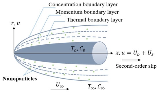 In this work, the steady forced convection flow of a nanofluid passing through a moving thin needle with uniform velocity in the same or opposite direction to the free stream is examined. is assumed as the composite velocity between the needle and free stream. The system is presumed to be affected by slip. The schematic view of the flow is given in Figure 1 where components u and v are the flow velocities in the direction of x- and r-axis, respectively. Let the needle radius be denoted by such that . Besides, the surface of the needle is maintained at uniform temperature and concentration, and , respectively, and these values are assumed to be greater than the ambient temperature and concentration, and . The equations that describe the motion, thermal energy and nanoparticle concentration may be written in usual notation as [5,24]: