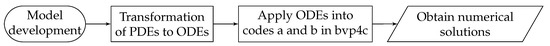 The nonlinear differential Equations (8)–(10) subject to the conditions (11) are executed through bvp4c solver in MATLAB software. In this solver, the initial guess at the starting mesh point is identified and the step size is changed to obtain the appropriate precisions. Despite that, it is compulsory to convert the differential equations into the first-order system of equation. Thus, the suitable variables used to reduce the equations have been introduced as follows: