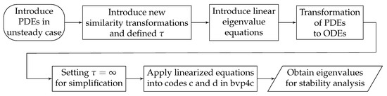 to examine the stability of solutions , and which satisfied the boundary value problem in Equations (19)–(22). The small relative to , and , respectively are given as , and and denoted the eigenvalue.