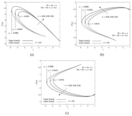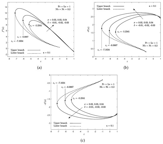 Figure 4a–c are illustrated to present the influence of on the variation of , and with when the second-order slip effect is absent (). It can be seen in Figure 4a,b that when there is no second-order slip, the wall shear stress and thermal energy flux enhance with the increase in the first-order slip parameter. Meanwhile, in Figure 4c the reduction of mass flux is noted for higher values of . In this proposed model, the occurrence of slip decreases the momentum and thermal layer thicknesses and thus, increasing both drag force and thermal energy flux on the needle wall. The fact that the presence of slip in the system slows down the separation of the boundary layer and this phenomenon is proven through turning points that unifies both upper and lower branch solutions. Further, it is seen that as the values of magnify from to , turning points are observed to diminish from to . This implies that the slip parameter gives a significant impact on the emergence of dual solutions. Besides, it is observed from Figure 4b,c that the graph for is a reflection of the graph because of the value of and considered is the same.