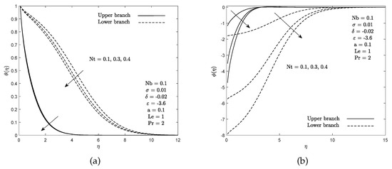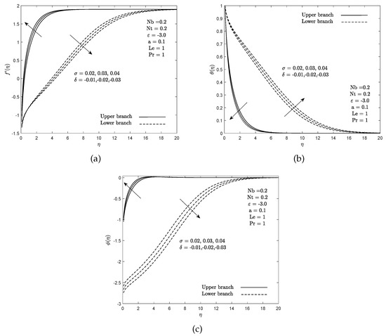 The variation of , and for several values of first-order slip parameter, second-order slip parameter and thermophoresis parameter are given in Figure 6a–c and Figure 7a,b. These figures revealed that the obtained profiles have achieved the prerequisites of far field boundary conditions (11) asymptotically. Therefore, it can be confidently said that the numerical results gained from the present work are precise. It is essential to stress that the dual nature of solutions in Figure 4 and Figure 5 has been supported by the existence of dual velocity, temperature and concentration in these figures. As predicted, the boundary layer thickness for the lower branch solution is thicker than the upper branch solution.