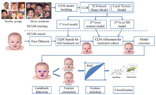 - Zhao, Q.; Rosenbaum, K.; Sze, R.; Zand, D.; Summar, M.; Linguraru, M.G. Down syndrome detection from facial photographs using machine learning techniques. In Proceedings of the Medical Imaging 2013: Computer-Aided Diagnosis, Lake Buena Vista, FL, USA, 9–14 February 2013; p. 867003. [Google Scholar]