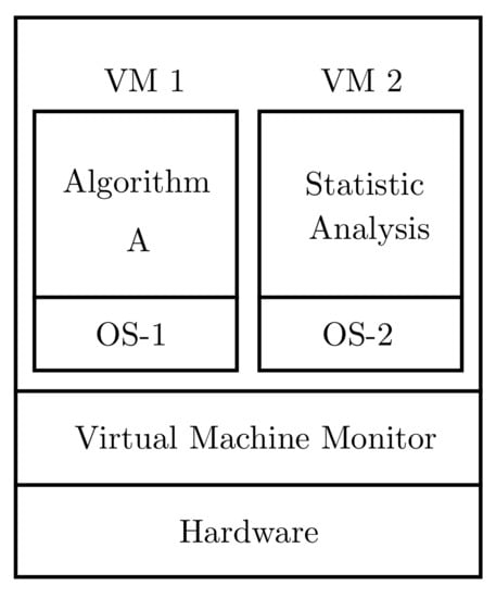 In the case of optimization algorithms, the GA algorithm runs on the OS1 operating system and the statistical analysis is executed on the OS2 operating system. Both operating systems run on top of the virtual machine monitor. VMM virtualizes all resources (for example, processors, memory, secondary storage, and networks) and allocates them to the various virtual machines running over VMM [].