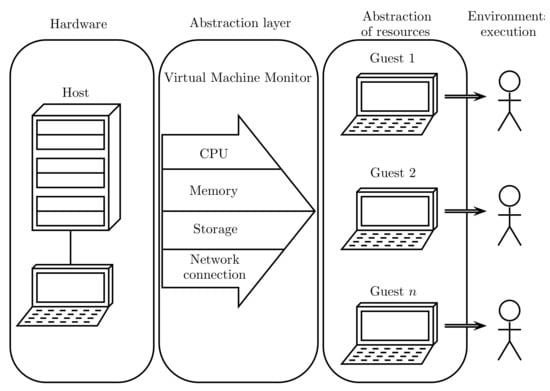 Figure 4 depicts the virtualization process, where the VMM creates an abstraction layer between the host hardware and the virtual machine operating system, appropriately managing its core resources (CPU, memory, storage, and network connections).