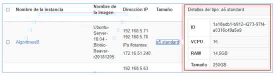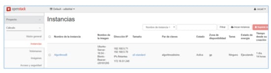 The CECAD private cloud has multiple R610 compute nodes, when using Openstack to provide infrastructure as a service (similar to Amazon EC2); this technology takes one of these servers to deploy the requested instance, in this case the "AlgoritmosB" instance. On the other hand, even though the server storage is apparently limited (73 GB), it has been configured through an architecture that uses the CEPH File System tool, a feature that allows allocating higher storage, in this case of 250 GB, since CEPH is configured to allow nodes to access 100 TB storage from the CECAD SAN. Figure 6 shows the instances using Openstack. The characteristics of the instance used are presented in Figure 7.