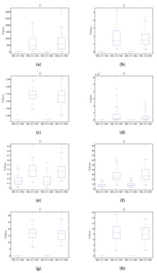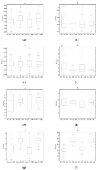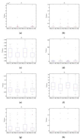 Box plot considering the value of the objective function using PSO, where the results for M1 and M2 do not present the difference for the respective configurations C1 and C2. (a) Diagram for . (b) Diagram for . (c) Diagram for . (d) Diagram for . (e) Diagram for . (f) Diagram for . (g) Diagram for . (h) Diagram for .
