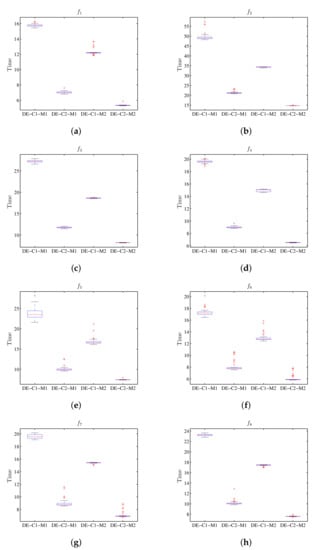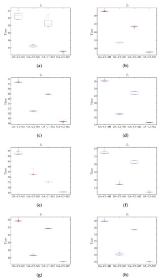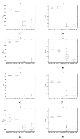 Box plot for the value of run-time using PSO, where the results for M1 and M2 show the difference for the respective configurations C1 and C2. (a) Diagram for . (b) Diagram for . (c) Diagram for . (d) Diagram for . (e) Diagram for . (f) Diagram for . (g) Diagram for . (h) Diagram for .