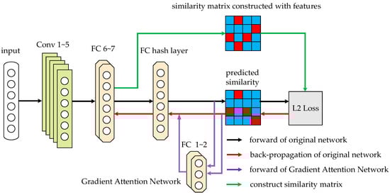 The optimization algorithm commonly used in current deep learning models is gradient descent. Huang et al. [] proposed that the hash model based on gradient descent optimization may fall into a dilemma during the optimization process, the hash codes of the paired images will always be updated in the direction of the other side, and the worst case is that the paired hash codes will exchange directions after being updated. This phenomenon is the “dilemma” of gradient descent. After falling into this dilemma, the Hamming distance corresponding to hash code will not be reduced, affecting the learning process, since this problem is caused by gradient changes in the process of updating hash codes in backpropagation. Selectively ignoring or reducing the gradient of one of the hash codes during backpropagation is an effective way to solve this problem. The gradient attention mechanism is designed to focus on the gradient of the paired image hash codes in supervised hashing.