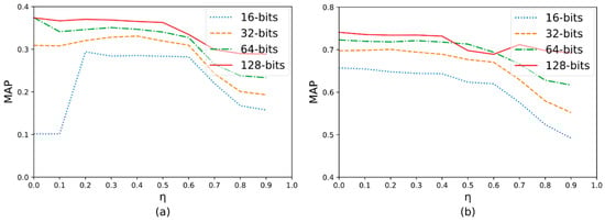 MAP on different η. (a) MAP on CIFAR-10; (b) MAP on NUS-WIDE.
