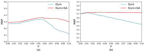 Figure 4 shows the effect of different learning rates on retrieval results. It can be seen from (a) and (b) in Figure 4 that, without the gradient attention mechanism, the retrieval quality will decline with the increase in the learning rate because, in the process of reverse propagation, when the learning rate is high, the network cannot converge. After using the gradient attention mechanism, the magnitude of the gradient descent is not only controlled by the learning rate, but also by the gradient attention. In the process of backpropagation, the gradient attention mechanism can select the appropriate gradient modification parameters for the network to obtain a better deep hash model.