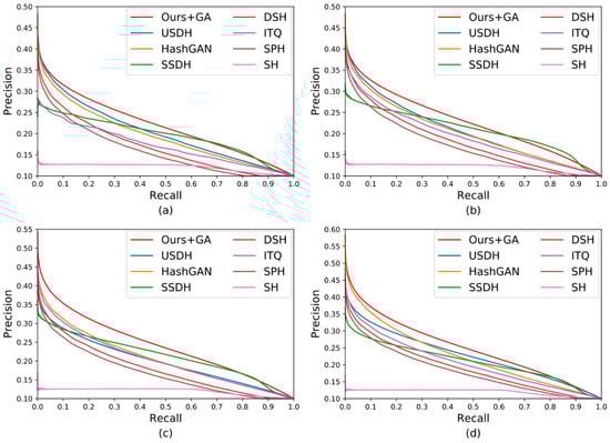 PR on CIFAR-10. (a) PR with code length 16; (b) PR with code length 32; (c) PR with code length 64; (d) PR with code length 128.