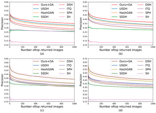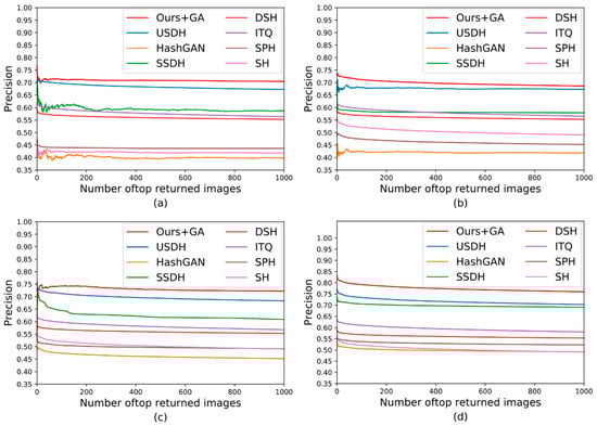In this article, the methods of SH (Spectral hashing) [], SPH (Spherical hashing) [], ITQ (Iterative quantization) [], DSH (Density Sensitive Hashing) [], SSDH (Semantic structure-based unsupervised deep hashing) [], HashGAN (Unsupervised Deep Generative Adversarial Hashing Network) [], and USDH (Unsupervised Semantic Deep Hashing) [] are selected for comparison. We use Mean Average Precision (MAP), Precision–Recall curves (PR) and the precision curves of the first 1000 retrieval results (P@N) as evaluation metrics.