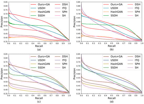 PR on NUS-WIDE. (a) PR with code length 16; (b) PR with code length 32; (c) PR with code length 64; (d) PR with code length 128.