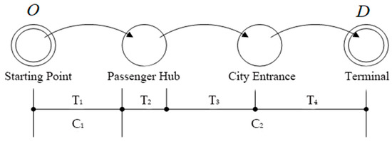 As shown in Figure 2, the expenses of passengers are segmented according to the travel itinerary, which includes four stages: travelling from the starting point to the passenger station, from the passenger station to the entrance of the city, from the entrance to the exit of the city through the urban road network, and from the exit of the city to the target city through the highway network. The respective travel times are , , and . The economic cost mainly includes the transportation cost from the starting point to the station () and the coach ticket cost (). The calculation formula for the generalised travel cost is: