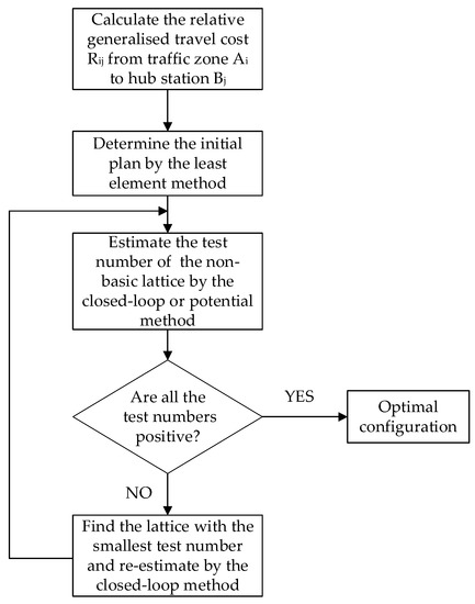 The total passenger volume of traffic zone is , and the demand from zone to passenger hub is . () is the relative generalised travel cost from zone to passenger hub . Thus, the distribution problem of the line is equivalent to the model presented in Equation (11). The on-table method is used to solve the model; the flow of the algorithm is shown in Figure 3.