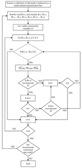 The one-by-one selection of line departure sites may lead to the problem of the total number of passengers departing from the site exceeding the site’s designed maximum passenger volume. Therefore, it is necessary to check and optimise the departing volume of each site; the specific adjustment calculation method is shown in Figure 4.
