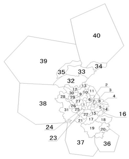 A case study was conducted in Nanjing, China, to confirm the validity of the proposed methodology. As shown in Figure 5, the future planned highway passenger transport hub system of Nanjing comprises a total of eight highway passenger stations, which are denoted as S1–S8. The planning indicators and service areas of each station are shown in Table 3. The service area of the highway passenger transport hub system is divided into 40 traffic zones; its distribution is shown in Figure 6.