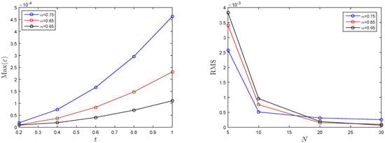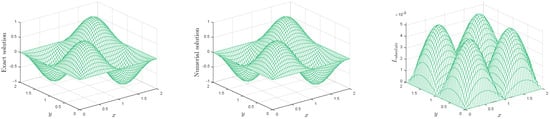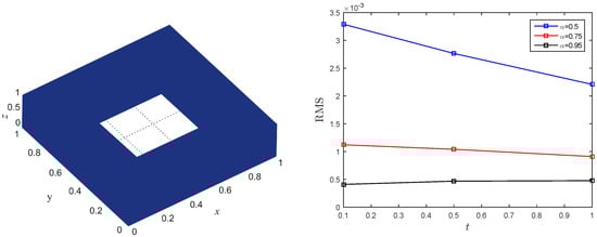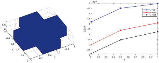 The simulation results for Test Problem in Section 3.3 are appeared in Figure 9 for various fractional-order and N. It tends to be see from the figure that the accuracy increments with increment in nodal points N to some extent. To testify the performance of the LMM on non-rectangular domains in three-dimensional case, the results are shown in Figure 10 and Figure 11.