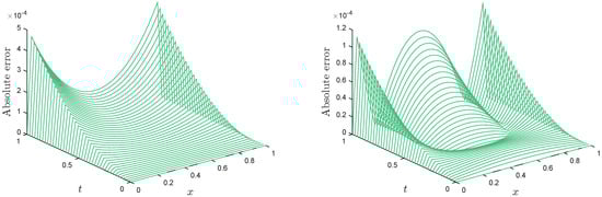 The simulation results for Test Problem in Section 3.1 are calculated utilizing the suggested LMM and Tabulated in Table 1 using various values of time-step size and nodal points N. It can be revealed from Table 1 that the accuracy increments to some extent with the increase in N and decrease in . Figure 1 (left) shows the results of different time t versus for whereas Figure 1 (right) shows the results at different nodal points N versus for . This figure is the evidence of good accuracy of the suggested LMM. The visual representation in form of absolute error for up to is given in Figure 2. Figure 3 represents the comparison of the proposed LMM and the method given in [], and we can see for this figure that the LMM method produced better results.