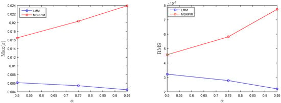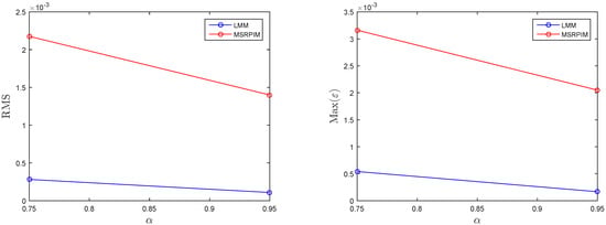 Simulation results of the LMM and the MSRPIM [] using , , , and for Test Problem in Section 3.1.