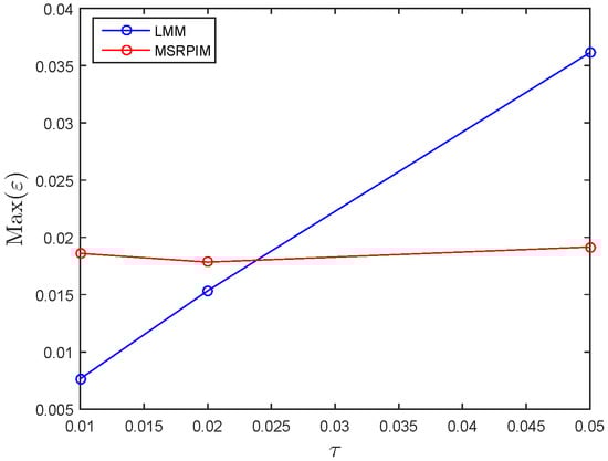 Simulation results of the LMM and the MSRPIM [] using , , , , and for Test Problem in Section 3.2.