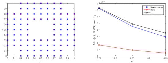 Computational domain (left) and numerical results in term of different errors norms (right) using , , , and for Test Problem in Section 3.2.