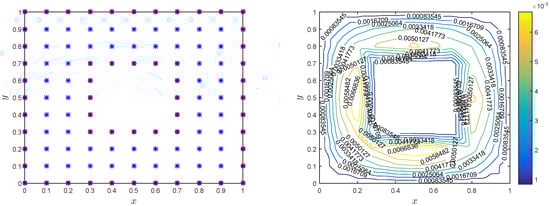 Computational domain (left) and absolute error (right) using , , and for Test Problem in Section 3.3.