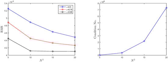 Simulation results using , , and (left) and condition number (right) for Test Problem in Section 3.3.