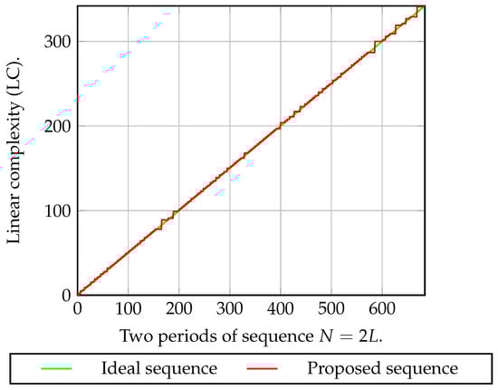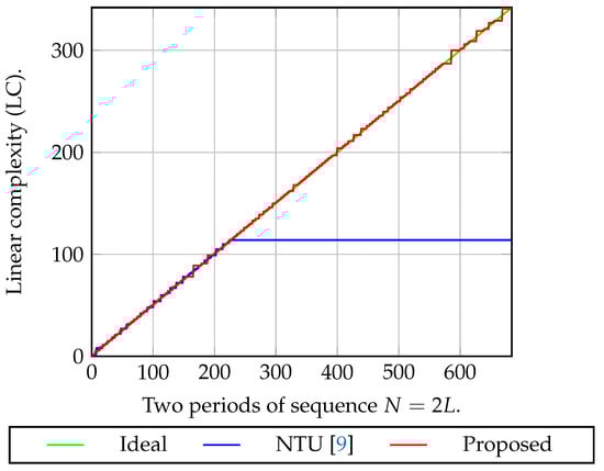 This section evaluates our proposed sequence by comparing with other sequence generated from primitive polynomial. We consider NTU sequence [] for this purpose as it is derived from primitive polynomial, trace function and Legendre symbol that matches ours methodically for fair comparison. Linear complexity and uniformity of bit pattern distribution of sequences are taken into consideration while comparing two sequences. For linear complexity, we derived linear complexity for different length of proposed MK and NTU sequences. Table 5 shows comparison results of linear complexity. For n bit sequence, linear complexity of the proposed sequence is which is similar to ideal. On the other hand, linear complexity of NTU sequence is lower than proposed sequence, i.e., ideal value. Then, we investigated linear complexity profile of both sequences and the result is showed in Figure 2 for and . The result indicates that the linear complexity profile of proposed sequence is almost similar to ideal. On the other hand, for NTU sequence it becomes saturated at a lower point and lags far behind the proposed sequence.