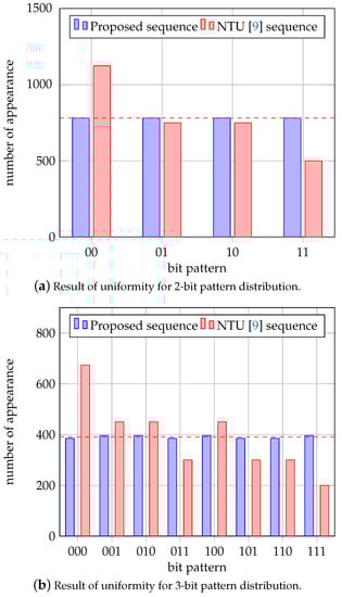 For comparison of uniformity of bit pattern distribution, we consider 2-bit pattern, i.e., () and 3-bit pattern, i.e., () to compare their number of appearance in the sequence. It should be noted that for ideal sequence, the number of appearance of any bit pattern should be equal in a sequence. The comparison result for 2 bit pattern and 3 bit pattern for and is showed in Figure 3. In Figure 3, dotted horizontal red line indicates the ideal value for bit pattern. The results indicate that bit patterns are equally distributed for proposed MK sequence. However, for NTU sequence, pattern distribution is irregular and varies more with increasing number of bit pattern considered.