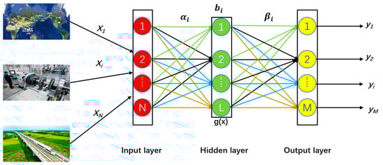 An ELM is a single-hidden-layer feedforward neural network, as Figure 1 shows, which consists of N input nodes, L hidden nodes, and M output nodes. represents the input vector of the ith input node, such as the axle box bearing information and working conditions, and represents the output vector of the ith output node.