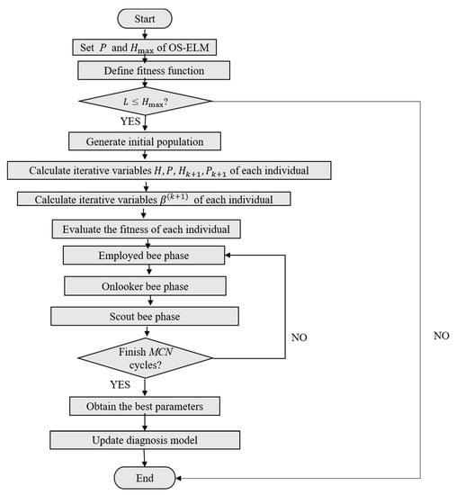 The fault diagnosis with the MS-ABC-OSELM is modeled, as exhibited in Figure 4, and proceeds as follows: