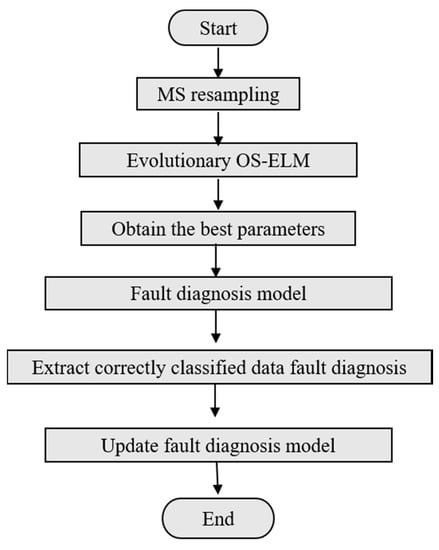 Flowchart of the mixed resampling online sequential extreme learning machine based on the artificial bee colony algorithm (MS-ABC-OSELM) fault diagnosis modeling.