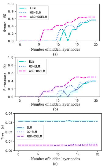 The evaluation metrics of the ELM, OS-ELM, and ABC-OSELM changed as a function of the number of hidden layer nodes: (a) G-mean, (b) F1-measure, and (c) time.