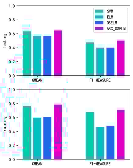 To verify the classification effect of the ABC-OSELM, we compared it with other existing methods. The G-mean, F1-measure, and running time were used as the evaluation metrics to analyze the experimental results.