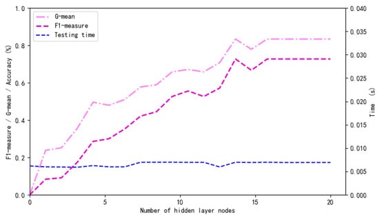 Figure 7 shows that when the hidden layer nodes number increased, the G-mean and F1-measure of the MS-ABC-OSELM increased to a certain level and then stabilized, and the testing time fluctuated between 0.005 s and 0.007 s, and did not fluctuate significantly with the number of hidden layer nodes. The MS-ABC-OSELM identified minority class samples after the number of hidden layer nodes was two, which was four less than the ABC-OSELM.