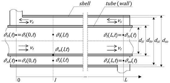 where and represent the inlet temperatures of the tube- and the shell-side fluids, respectively, i.e., their temperatures measured at . Therefore, from the control theory point of view, these inlet temperatures can be seen as the boundary input signals to the heat exchanger system. Their variations in time affect the temperature distribution of both fluids along the exchanger, and, most importantly, their outflow temperatures at ,