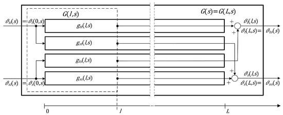 As follows from the comments in the introductory Section 1 and at the end of Section 2.1, it would be desirable to apply here some kind of mathematical representation of the input–output relationship between the boundary temperatures of the exchanger. Such a representation, expressed in the Laplace transform domain, is commonly used in the fields of signal processing and control theory and known as the transfer function of a dynamical system. Below, we recall results on the transfer function representation of the considered double-pipe heat exchanger which were presented in our work []. Since we are dealing with the distributed parameter system, we consider here the distributed transfer functions , where the value of the transfer function depends not only of the complex variable s, but also on the spatial position l at which this transfer function is evaluated.