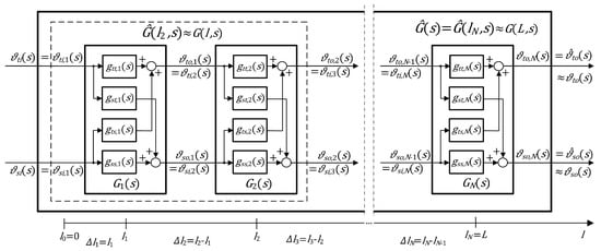 The transfer function matrix given by Equations (46) and (47) can be therefore seen as a rational approximation of the distributed transfer function matrix discussed in Section 2.2, evaluated at . Since it describes cascade interconnection of n dynamical subsystems, it can be calculated as follows:
