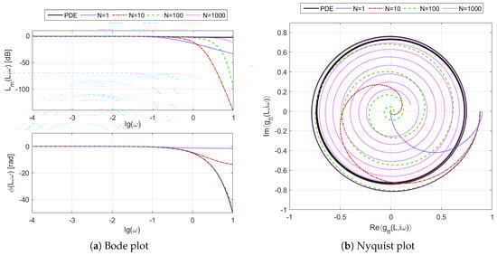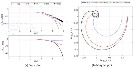 In the considered case of DPS, the graphical representation of its frequency responses can take the form of three-dimensional graphs, showing their dependence on both the angular frequency and the space variable l. Another possibility is their representation in the form of classical two-dimensional plots, determined for the fixed value of the space variable, e.g., for the exchanger outflow point (see Figure 2). These responses can be represented in several ways, of which two are most commonly used in control theory: Nyquist and Bode plots. The Bode plot is a combination of a magnitude plot, expressing the magnitude of the frequency response, and a phase plot, expressing the phase shift. The expressions for the logarithmic magnitude and phase take here the following form []: